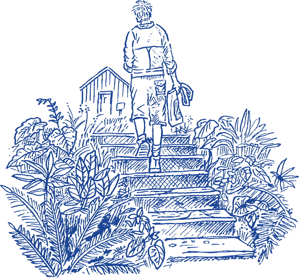 A short distance out of town, a grassy animal trail led to a staircase that I could look up. Panting for breath, I continued on, the shade of the trees swaying beside me. Beyond the expanse of light, I found a small blue prefab hut. Catching my breath, I put my hand on the doorknob of the wooden door.