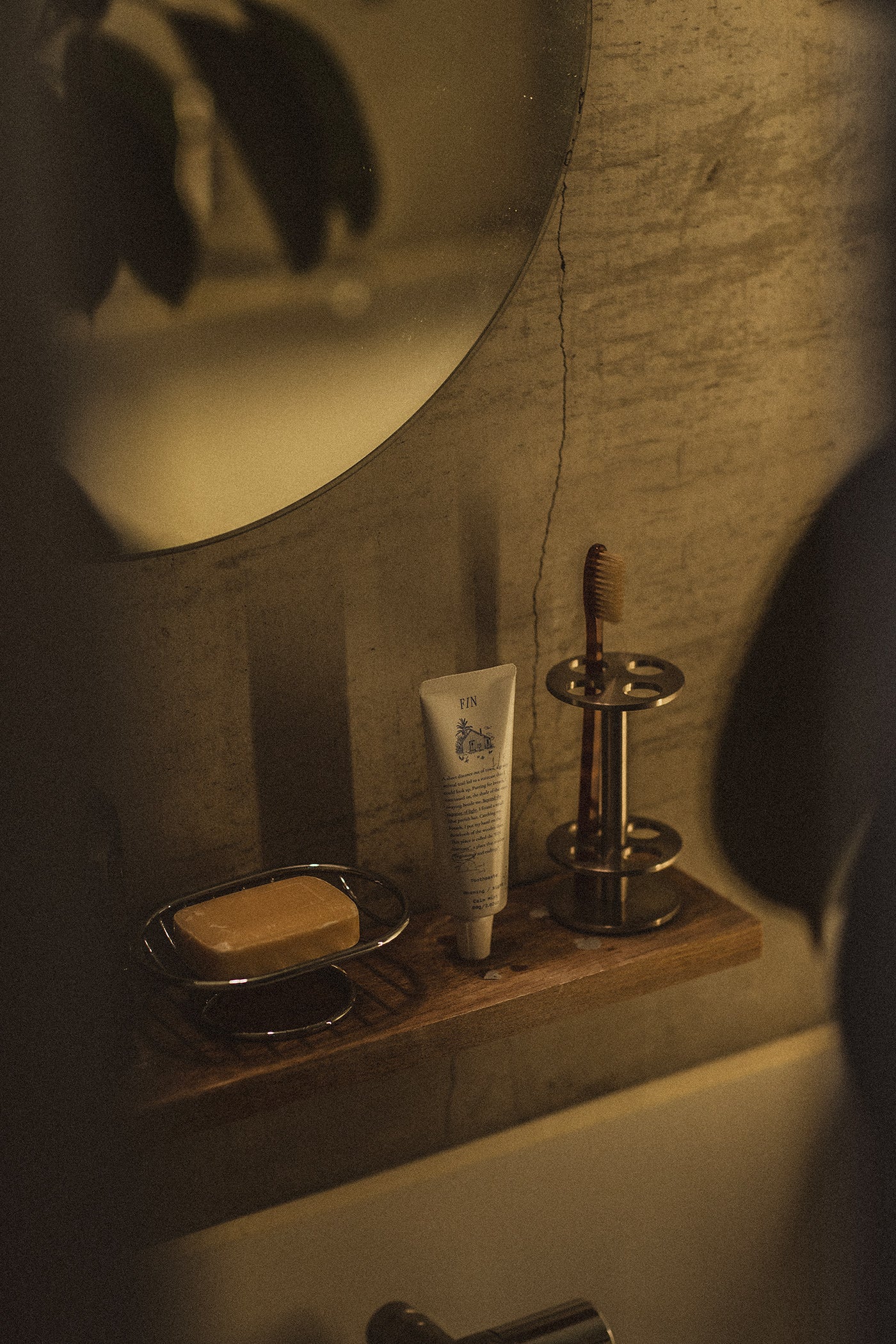 FINの研究所を表すイラストを施した巾着。歯磨き粉と歯ブラシを入れていつでもそばに。綿の柔らかさが手に馴染みます。